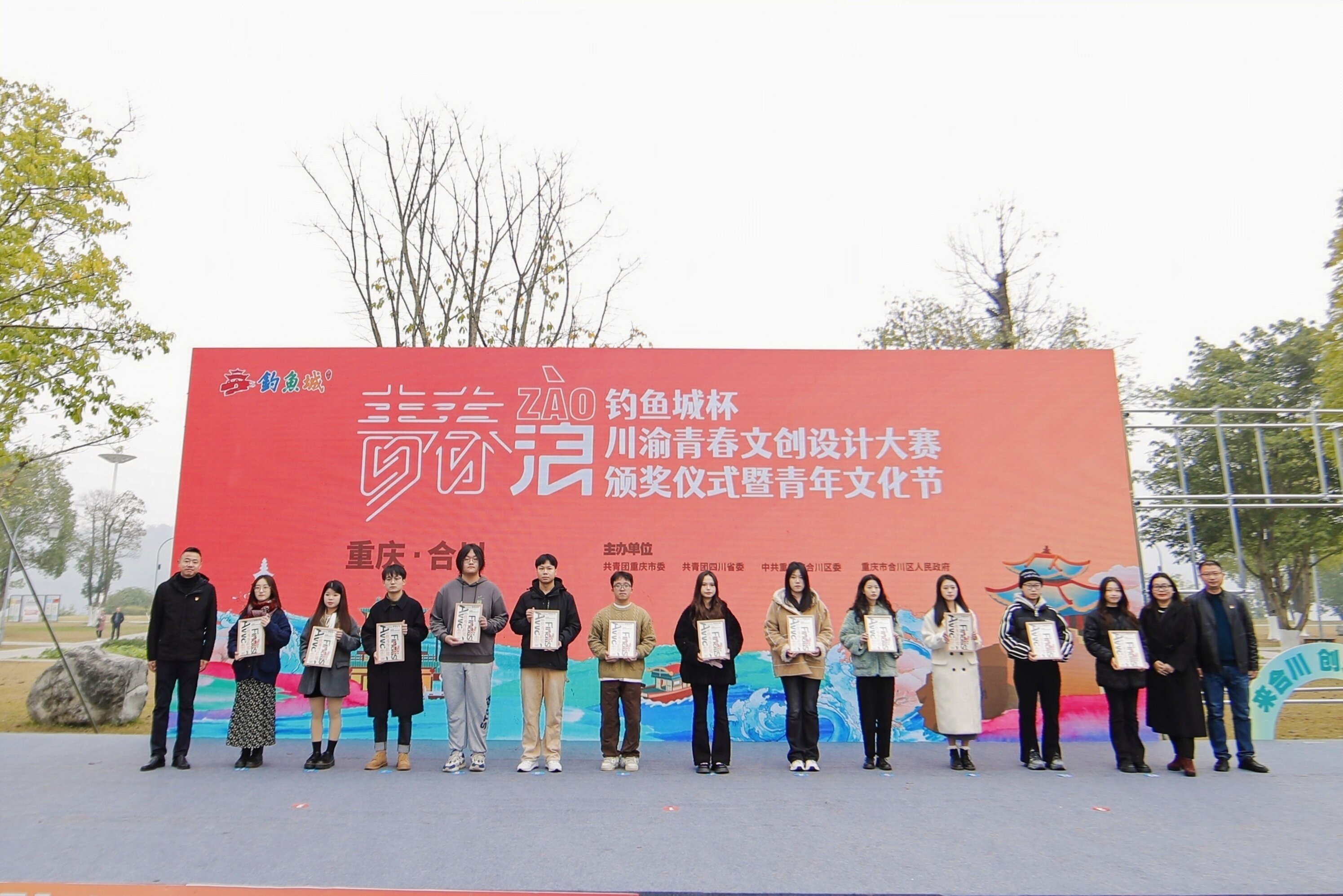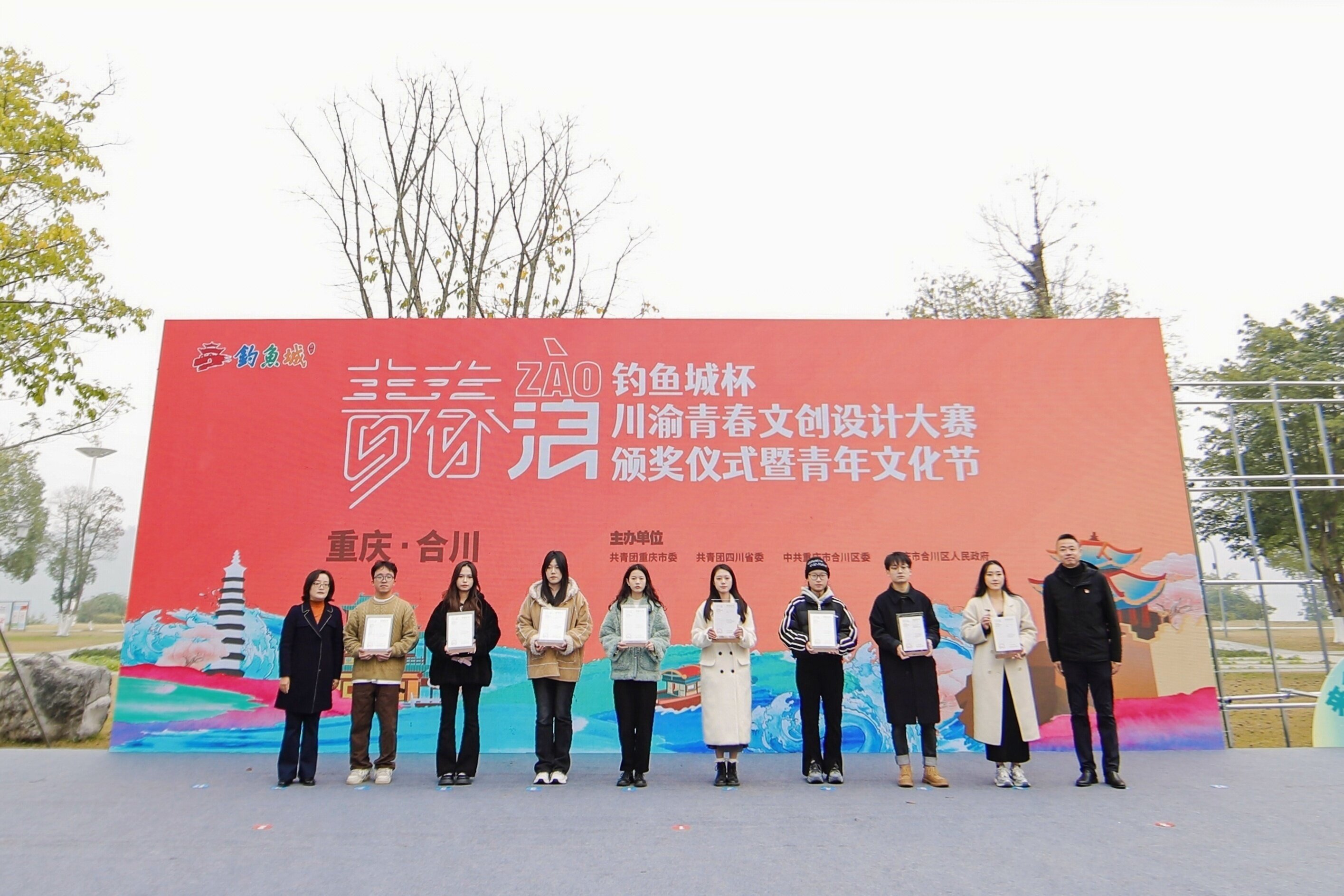 颁奖仪式现场,合川区委宣传部、合川区委统战部、团合川区委、合川区教委、合川区住房和城乡建委、合川区文化和旅游委、合川区城投(集团)公司、钓鱼城文旅公司等相关负责人,专家评审组代表,重庆对外经贸学院、重庆移通学院、四川美术学院等高校代表,匠人渝等文化创意行业代表,获奖选手代表等百余人齐聚,共赴青春之约。