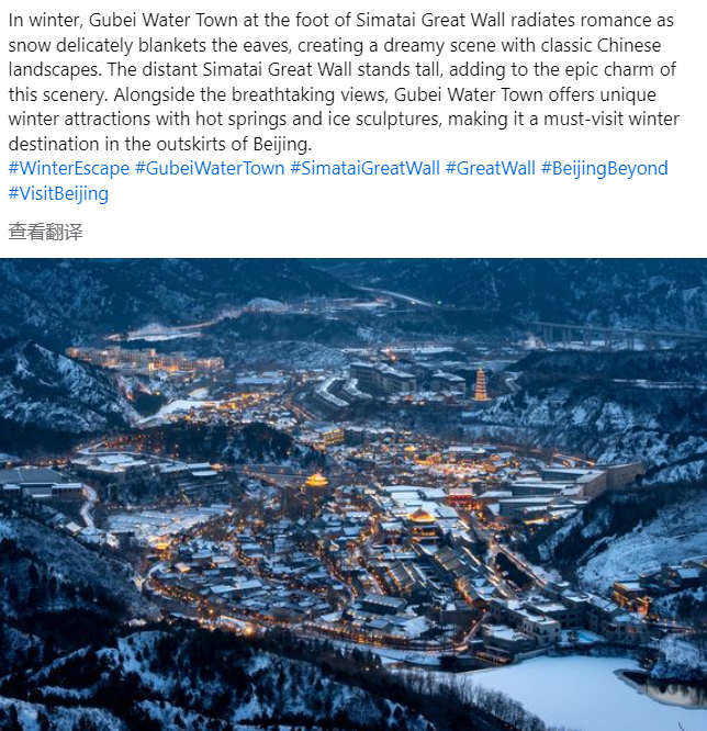 本月优秀Facebook贴文是北京市文化和旅游局1月6日发布的介绍古北水镇的贴文,不仅图片具有吸引力,文案也非常优美(以下为译文):“冬季,司马台长城脚下的古北水镇散发着浪漫,白雪细腻地覆盖屋檐,创造出中国经典风景的梦幻场景。遥远的司马台长城高耸挺立,为这景色增添了史诗般的魅力”,该贴文一共收到了1.7万个点赞、153条点评、199次转发。