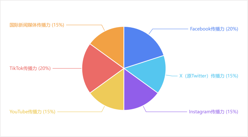 全国省级文化和旅游综合国际传播力指数的评价维度由Facebook传播力、TikTok传播力、X传播力、Instagram传播力、YouTube传播力和国际新闻媒体传播力六个部分构成,权重分别为20%、20%、15%、15%、15%、15%。