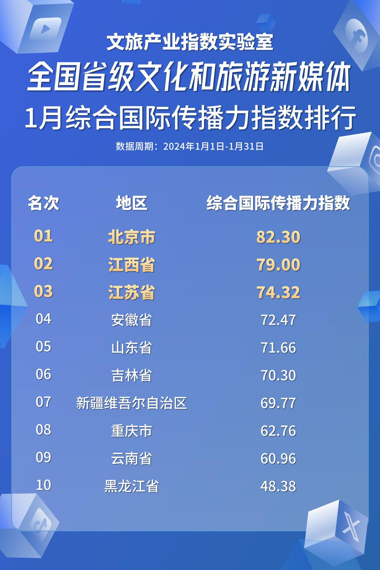 基于对以上各评价维度的综合评价,1月,全国各省级文化和旅游综合国际传播力指数排在前列的为:北京市、江西省、江苏省、安徽省、山东省、吉林省、新疆维吾尔自治区、重庆市、云南省、黑龙江。
