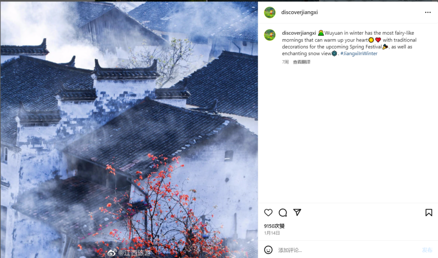本月优秀Instagram贴文是1月14日,江西省文化和旅游厅发布了一幅典型中国风特色照片,近镜头的红梅和远镜头的白墙黛瓦传统建筑完美契合,无论是在色彩上还是在层次上,都给人留下深刻印象,共收到9150次点赞。