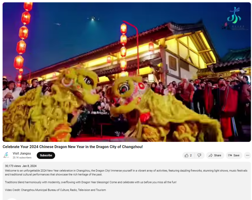 本月优秀YouTube视频是江苏省文化和旅游厅1月8日发布了一支3分08秒视频,展现了一系列充满活力的活动,包括耀眼的烟花、令人惊叹的灯光秀、音乐节和传统文化表演等,共吸引超过3万人次观看。