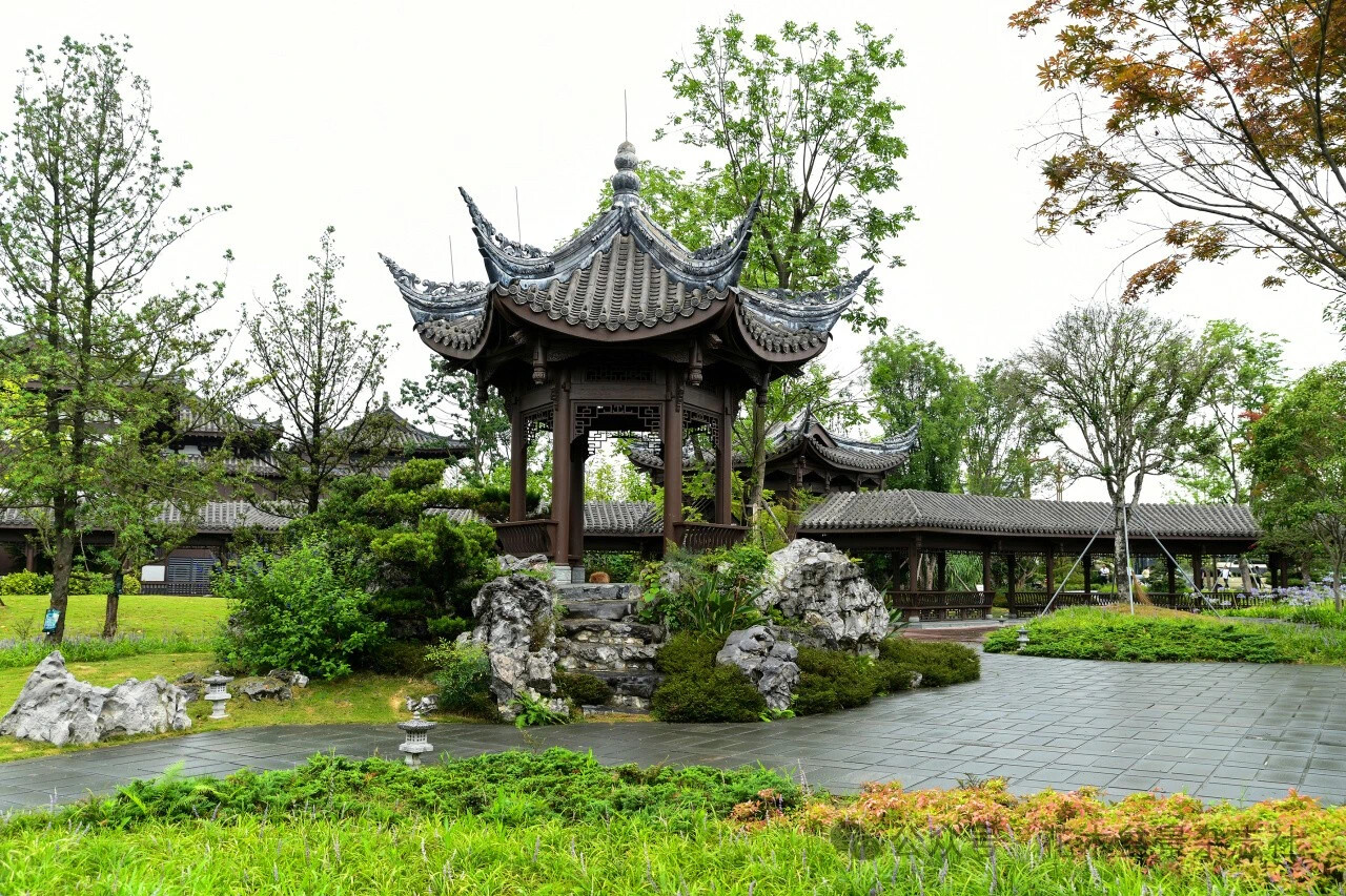 亭台楼阁错落有致,建筑房屋雕梁画栋,园区内小桥流水……一座座古韵建筑物和碧湖相映生辉,人文景观与自然景观巧妙结合。为深入感受成都世园会“公园城市 美好人居”主题,采风团还来到距离主会场不远的成都天府艺术公园·蜀园,行走其间,仿佛踱步于古朴雅致的画卷中。