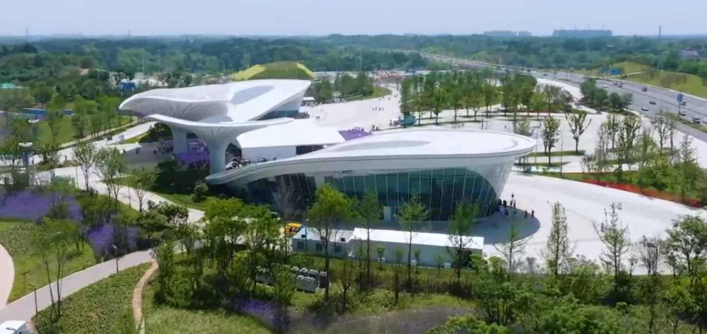 在成都东部新区主会场入口,自然起伏的山峦间,绛溪河从中蜿蜒而过,月亮桥、鱼凫桥等景观桥依次排开,清澈流水的映衬下,一株株木芙蓉枝繁叶茂,3片花瓣造型的建筑格外引人注目。这座建筑是隐藏的“雨水收集神器”,预计年收集雨水量约2500吨,可满足园区2公顷绿地的日常浇灌用水。主展馆的设计巧妙,利用自然通风采光,让建筑兼顾夏季遮阳与冬季集热功能,减少了运维能耗。同时,巧妙引入湖面低温度新风,降低空调使用能耗。