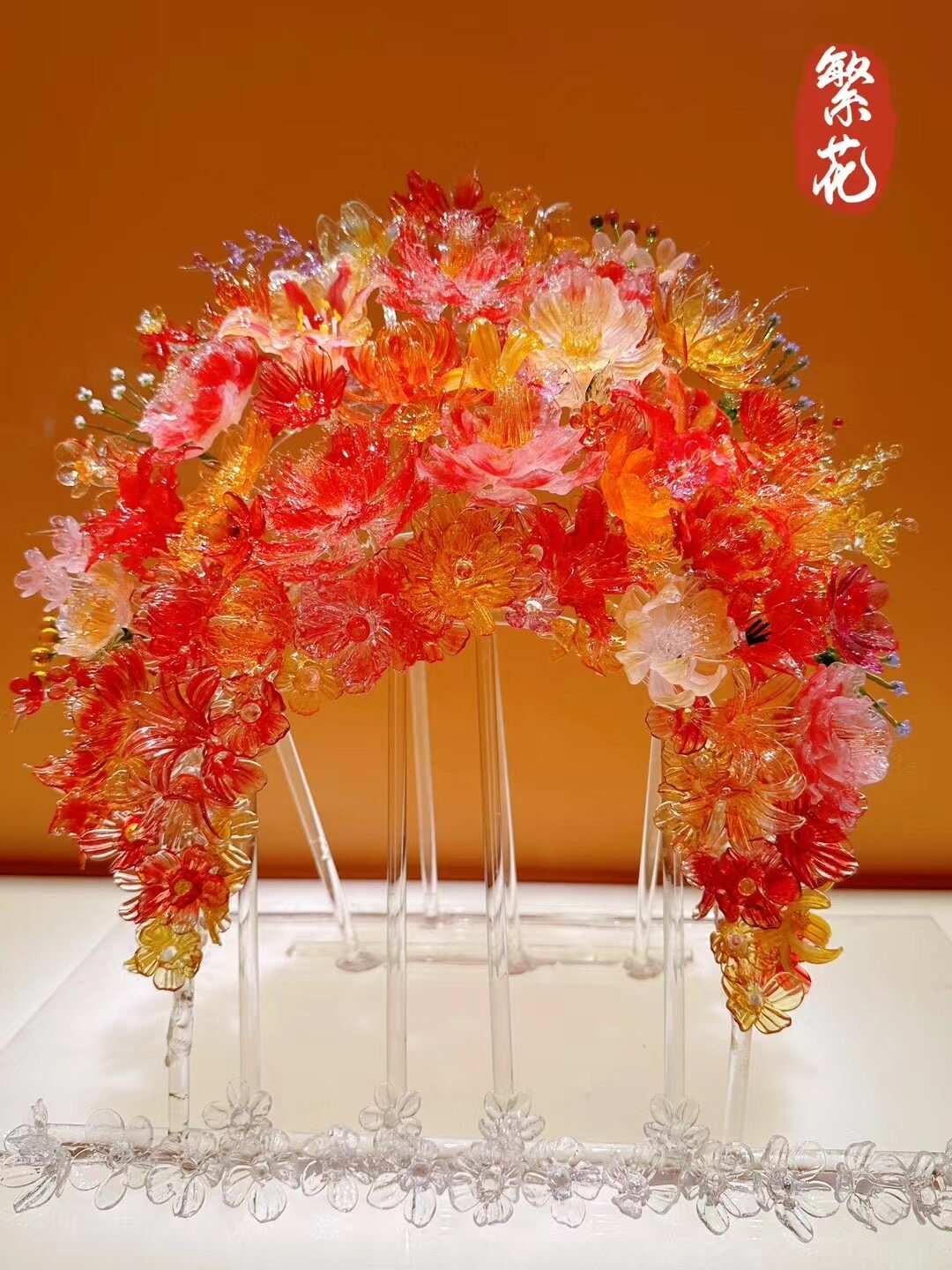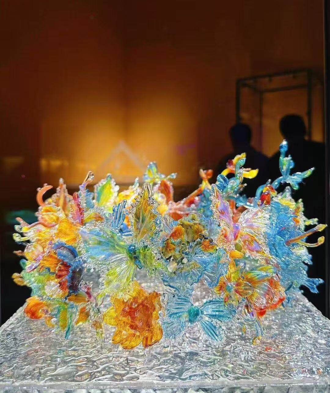 “璆琳佳器”单元展示的《十二花神系列》《蝴蝶灵蛇花冠》灯工琉璃作品也是市民游客热衷的拍照打卡物,不少人就是冲着这两套作品来观展的。山东游客李立说:“以前在淄博陶瓷琉璃博物馆看过,念念不忘,没想到居然在国博还能遇到。”《蝴蝶灵蛇花冠》的制作者刘媛此前也在社交平台发文说:“超荣幸自己创作的花冠被用到了琉璃展的海报上。”
