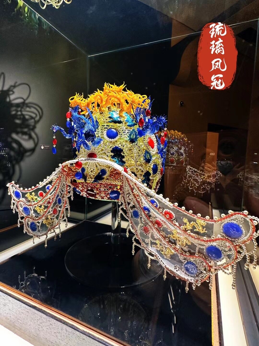 《琉璃凤冠》无疑成为展览中闪耀的存在。这顶由3个年轻人耗时62天,共同创作完成的琉璃凤冠和古代中国展厅内的明孝端皇后凤冠遥相呼应。《琉璃凤冠》制作者之一、“00后”孙启烨在社交平台兴奋地发出作品被市民游客围观打卡的视频,并发文说:“非常感谢国博和淄博市政府为年轻手艺人提供了这次展示机会。”