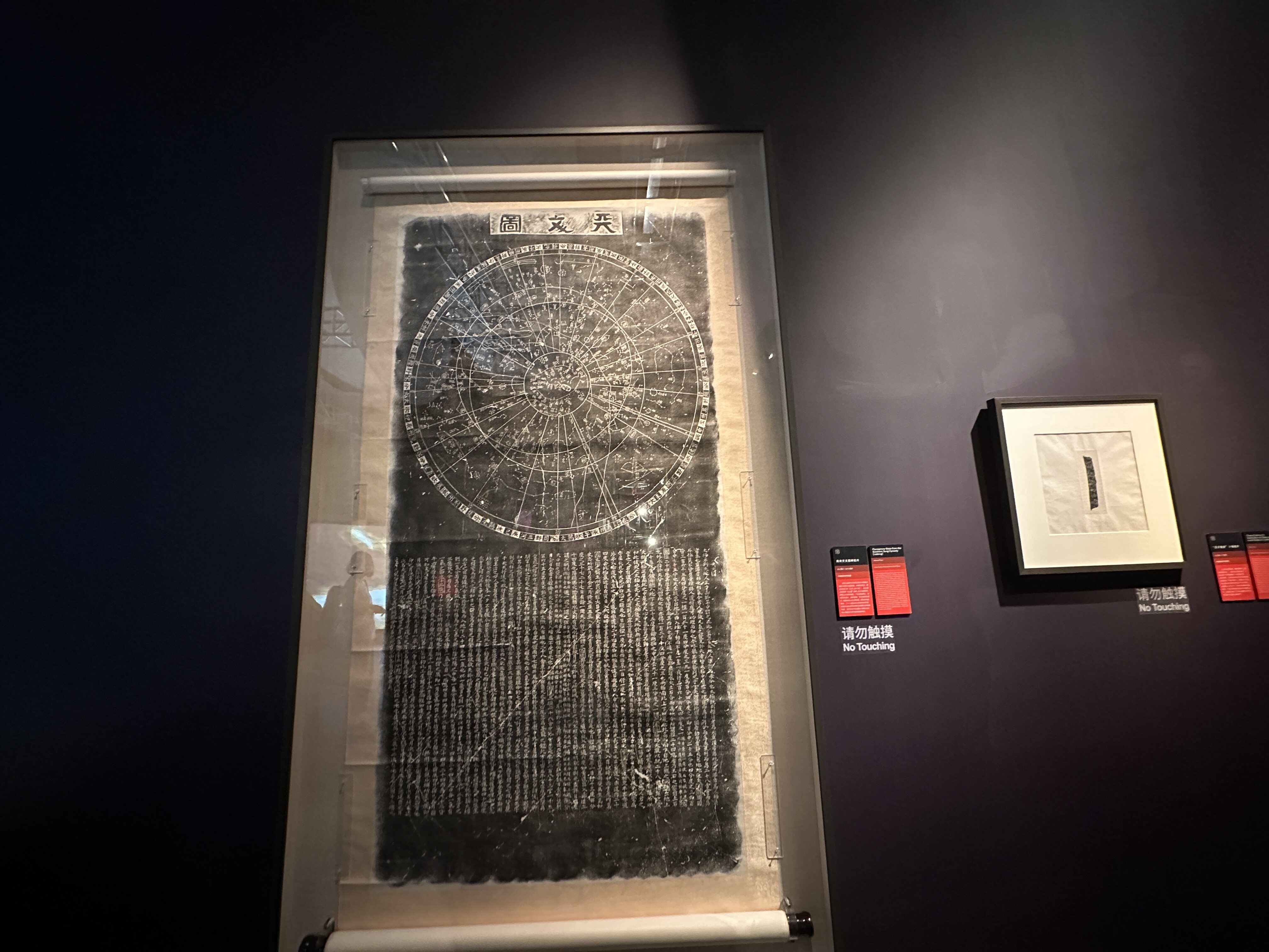 展览还展出了中国国家博物馆藏的《南宋天文图碑拓片》,此图是南宋宁宗时期礼部尚书黄裳依据实测资料绘成星图,撰写释文。理宗淳祐七年(公元1247年)由王致远主刀刻成“天文图”石碑,此为石碑拓片。碑面上半部刻星图,下半部刻释文,阐释天体运行、四季更替、历法推算等理论。星图共刻1434颗恒星,还绘有赤道、黄道、二十八宿区线以及银河的界线。此图远比欧洲同时期的星图更为系统和完整,现代天文学家通过计算机比对,确认其星位与现代星表高度吻合。
