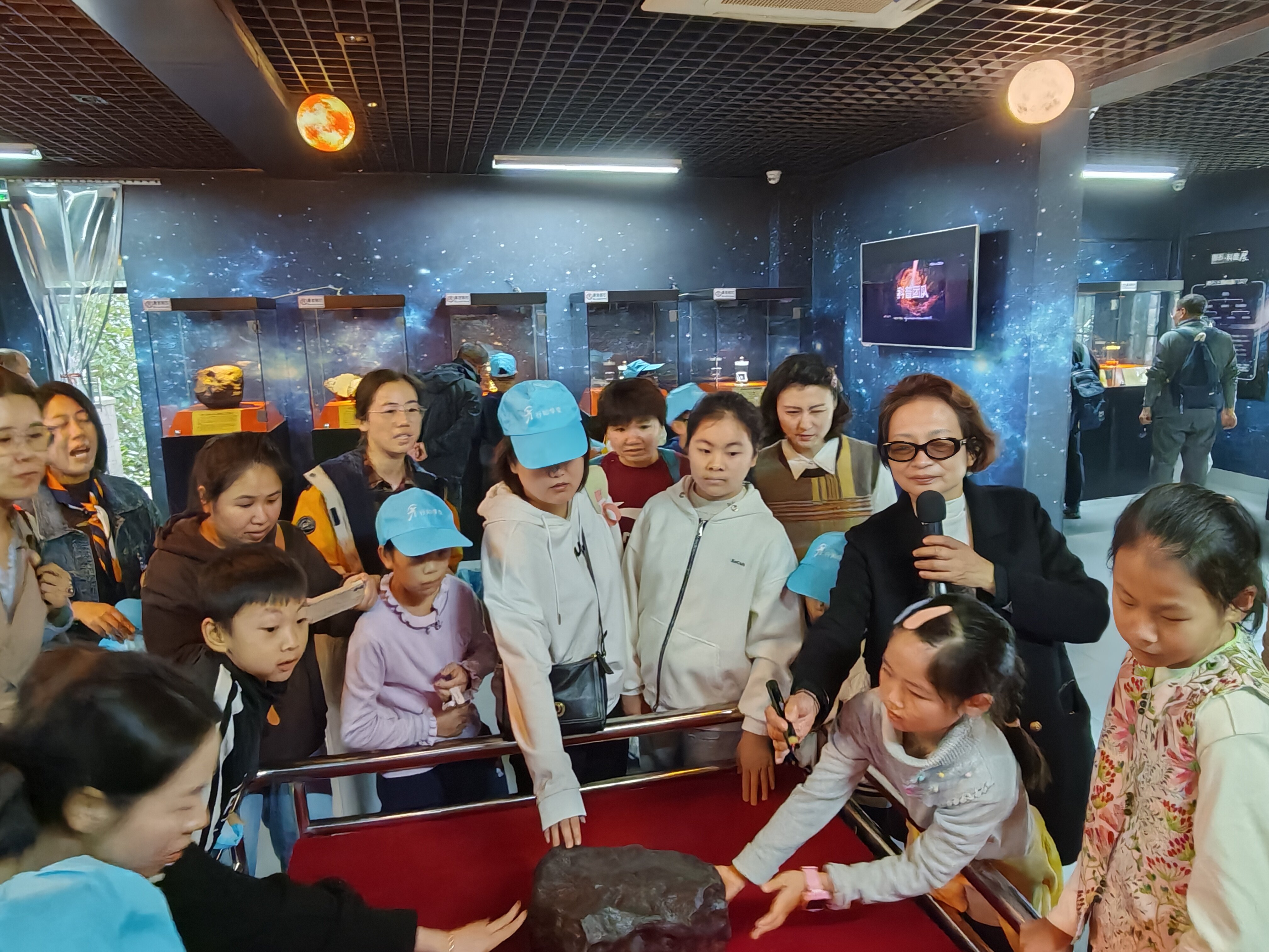 陨石博物馆内,20余件形态各异、来源不同的“天外来客”引发全场好奇。“这是46亿年前形成的陨石,摸上去比普通石头更凉。”在讲解员引导下,孩子们轻轻触摸陨石表面,感受宇宙光阴的印记。家长李女士感慨:“平时只能在书本上看到的知识,今天变成了可触摸的体验,这种认知升级很难得。”