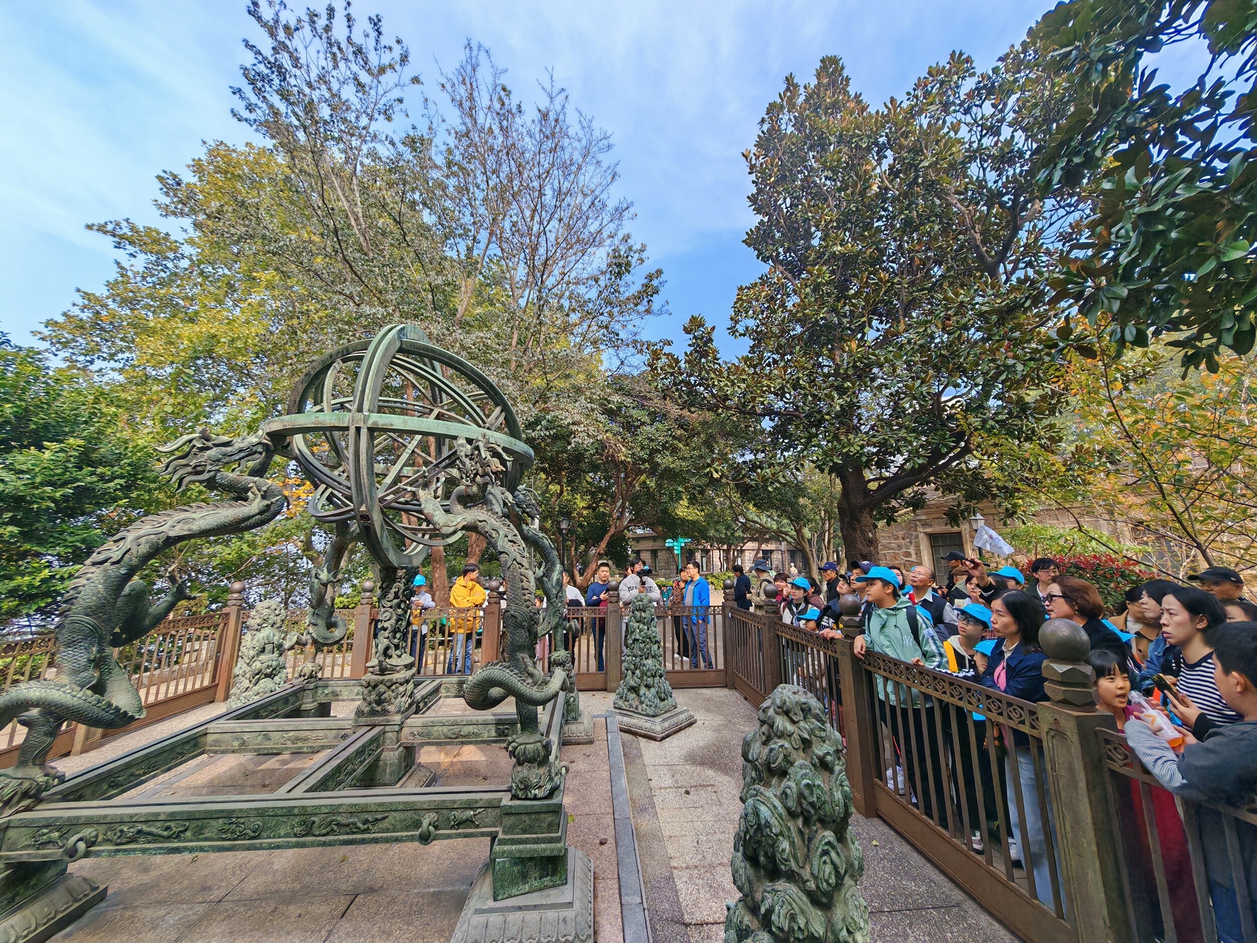 在古天文仪器区,讲解员生动解读了天球仪、浑仪、简仪的科学原理,“这台青铜铸就的‘古代天文望远镜’,可通过三重环圈测量天体的赤道、黄道和地平坐标,体现了古人的卓越智慧。”孩子们围拢在四龙托举的浑仪旁,认真聆听记录。