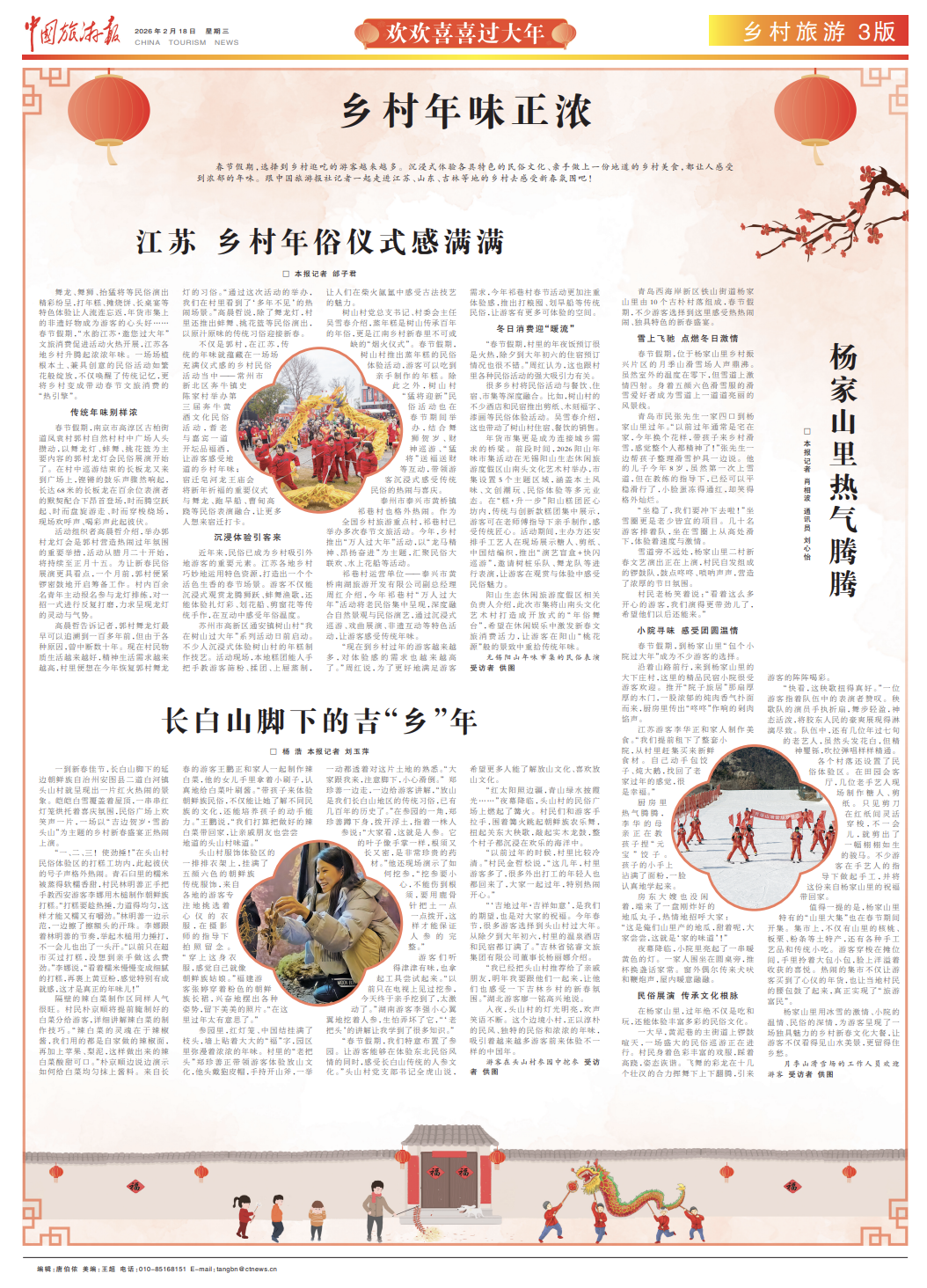 舞龙、舞狮、抬猛将等民俗演出精彩纷呈,打年糕、摊烧饼、长桌宴等特色体验让人流连忘返,年货市集上的非遗好物成为游客的心头好……春节假期,“水韵江苏·邀您过大年”文旅消费促进活动火热开展,江苏各地乡村升腾起浓浓年味。一场场植根本土、兼具创意的民俗活动如繁花般绽放,不仅唤醒了传统记忆,更将乡村变成带动春节文旅消费的“热引擎”。