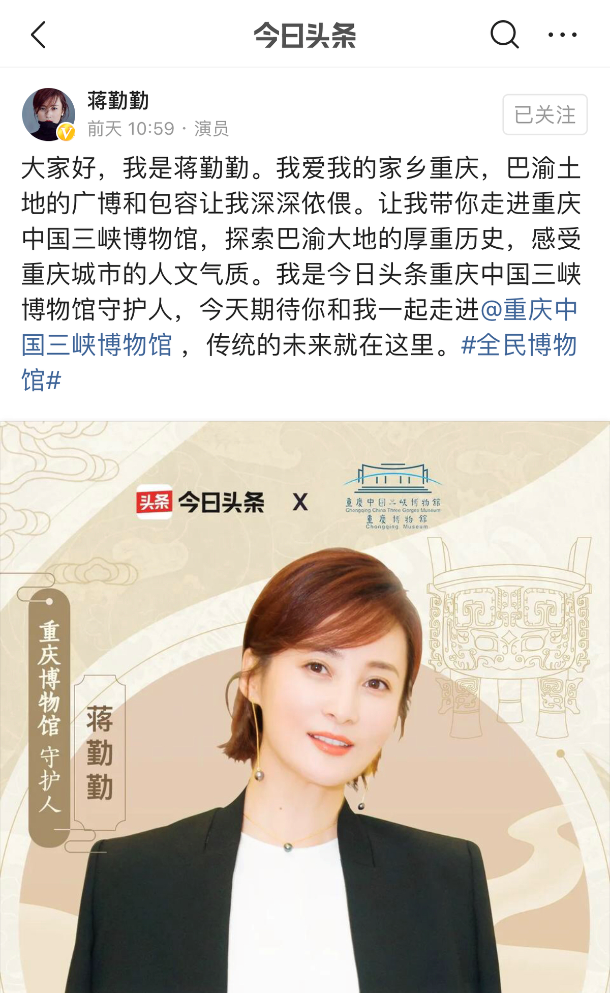 知名演员蒋勤勤作为土生土长的重庆人,也以重庆博物馆“守护人”的角色发布微头条,号召网友关注重庆中国三峡博物馆,感受重庆厚重的历史、独特的人文。该动态两天时间突破百万阅读,获得近万名网友点赞支持。