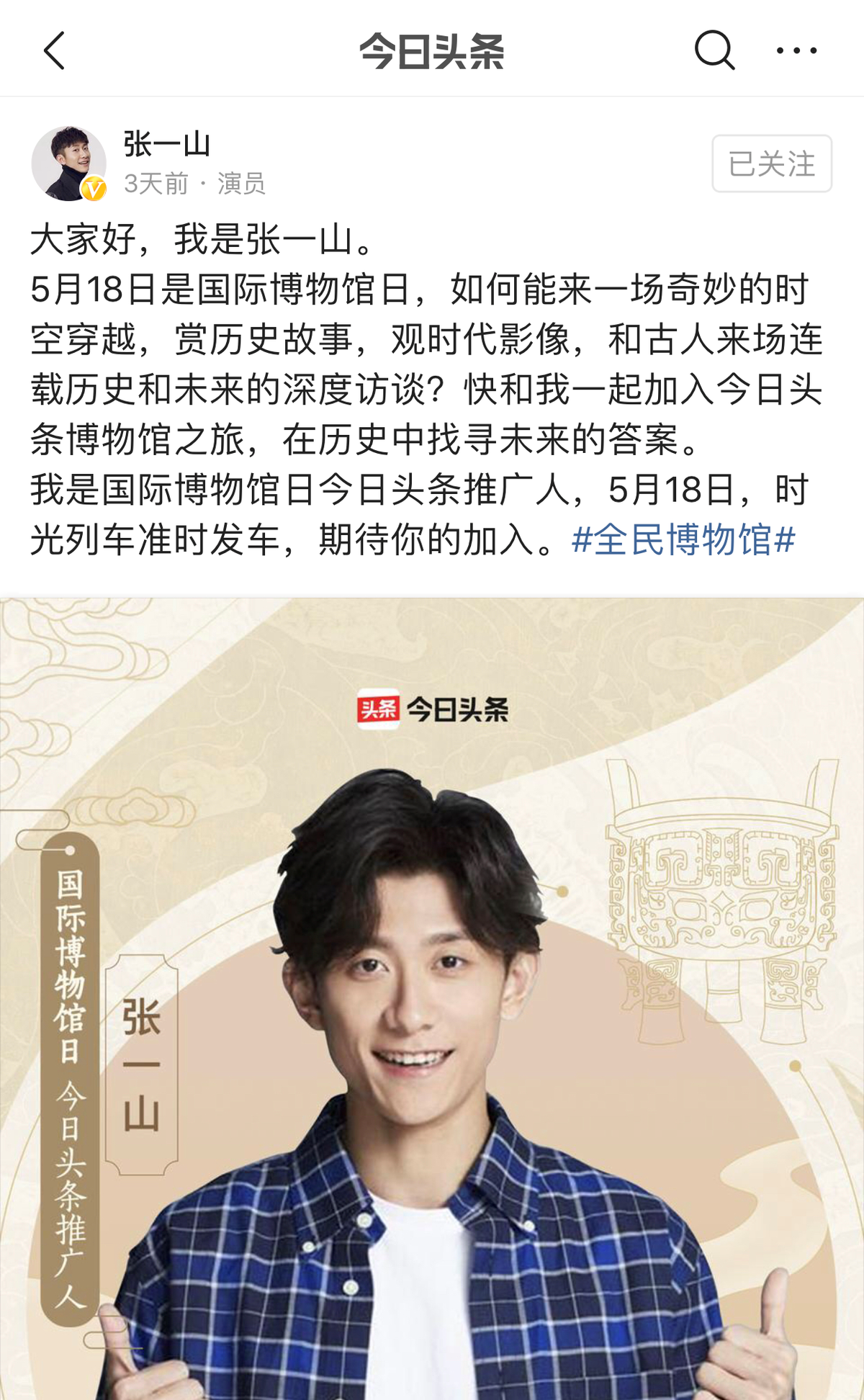 张一山作为“国际博物馆日”的今日头条推广人,于5月17日发布微头条,邀请网友关注并参与“全民博物馆”活动,感受历史与传统文化的力量。仅3天时间,该条动态便获得了近200万的阅读与互动,网友们纷纷留言表示“民族文化需传承,历史使命需牢记”。