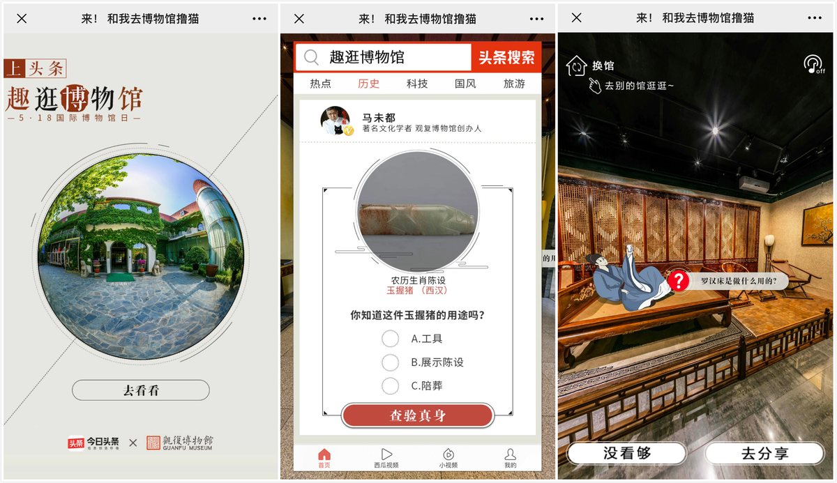 此外,基于本次活动,今日头条与观复博物馆联合上线“趣逛博物馆”H5,利用VR技术让用户随时随地“去”逛博物馆,并且在逛博物馆的同时,以答题和小测试的形式与历史文物进行互动,了解更多、更有趣的历史知识,获取更多博物馆信息。据官方统计,本次通过H5参观观复博物馆的网友超150万人次。